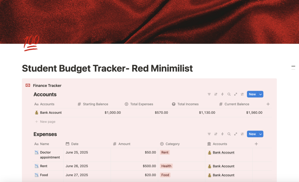 Built with a calming minimalist Red aesthetic, this template keeps your finances organised without the clutter. Ideal for students, casual workers, or anyone wanting a simple system to manage money in Notion.